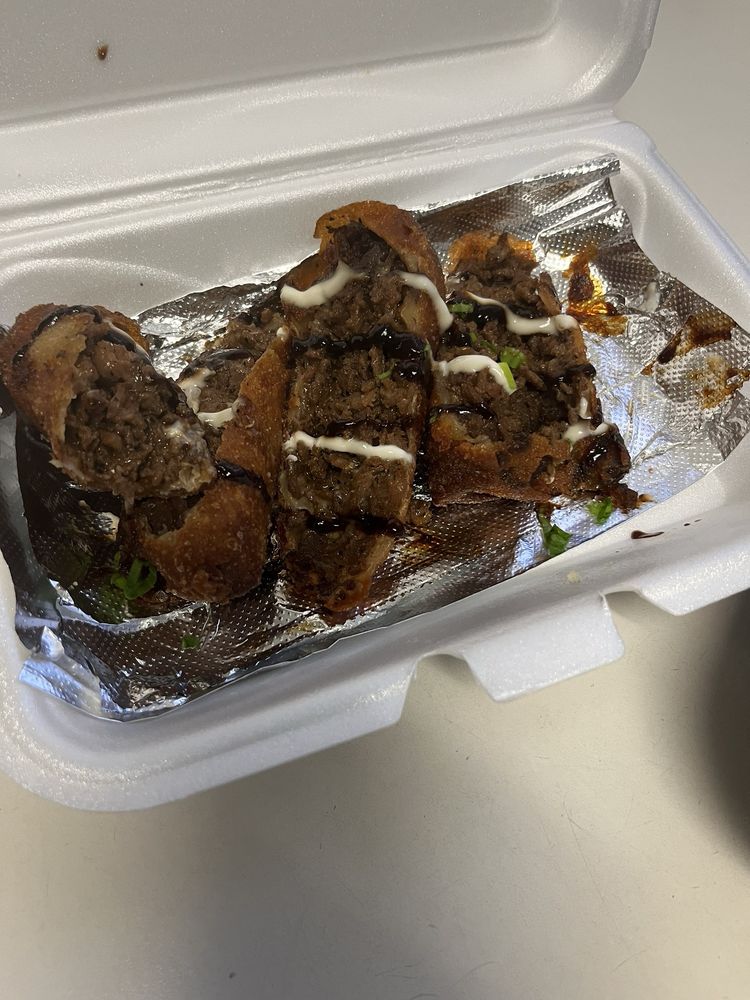 Tender beef, melted cheese, and jerk seasoning wrapped in a crispy egg roll, drizzled with savory sauce and garnished with green onions.