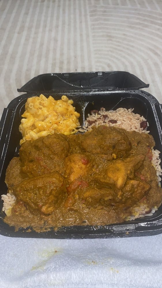 Curry chicken served with two sides; choose from vegetables, various rice, mac-n-cheese, assorted fries, plantains, yams, or onion rings.