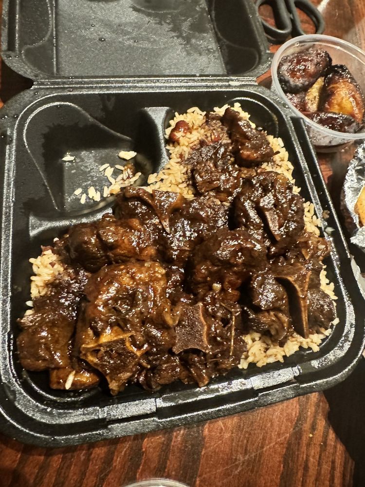 Oxtail served with choice of side: steamed cabbage, turkey collards, rice options, mac-n-cheese, yams, plantains, various fries, or onion rings.